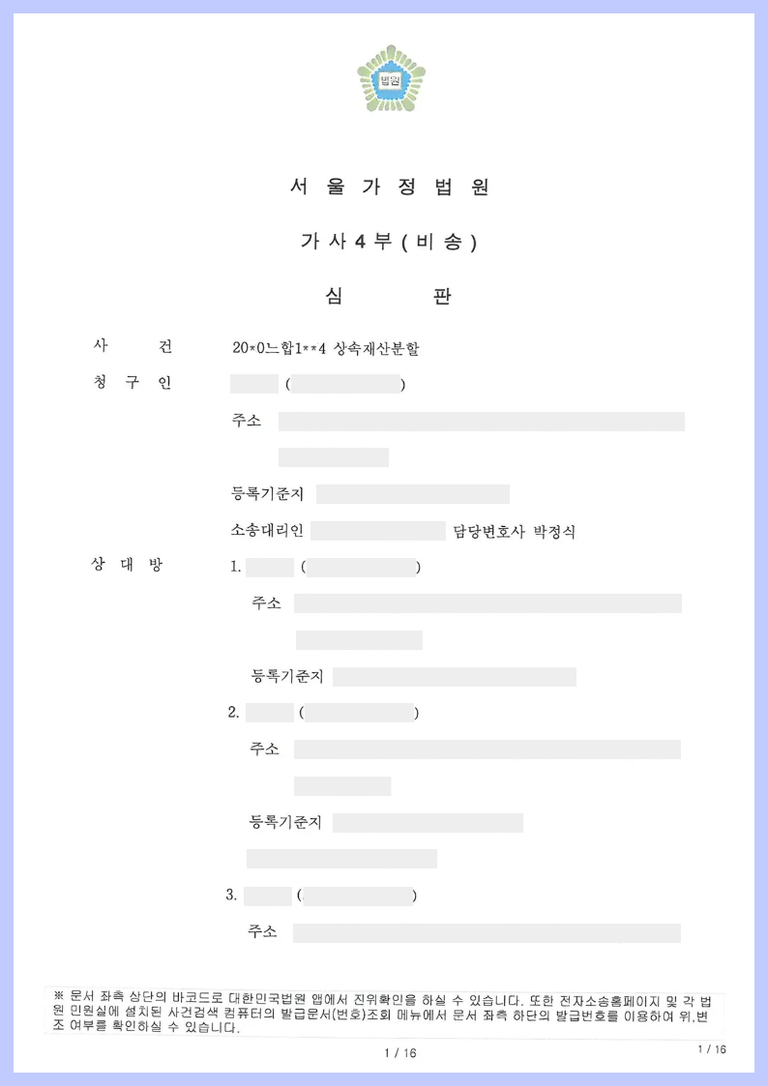 청구인은 2남 1녀 중 장남으로 부친 사망 이후 부친 명의로 남아 있던 일부 부동산과 주식을 포함한 금융재산에 대해서 모친과 나머지 나머지 형제자매들을 상대로 상속재산분할심판청구를 하였습니다.