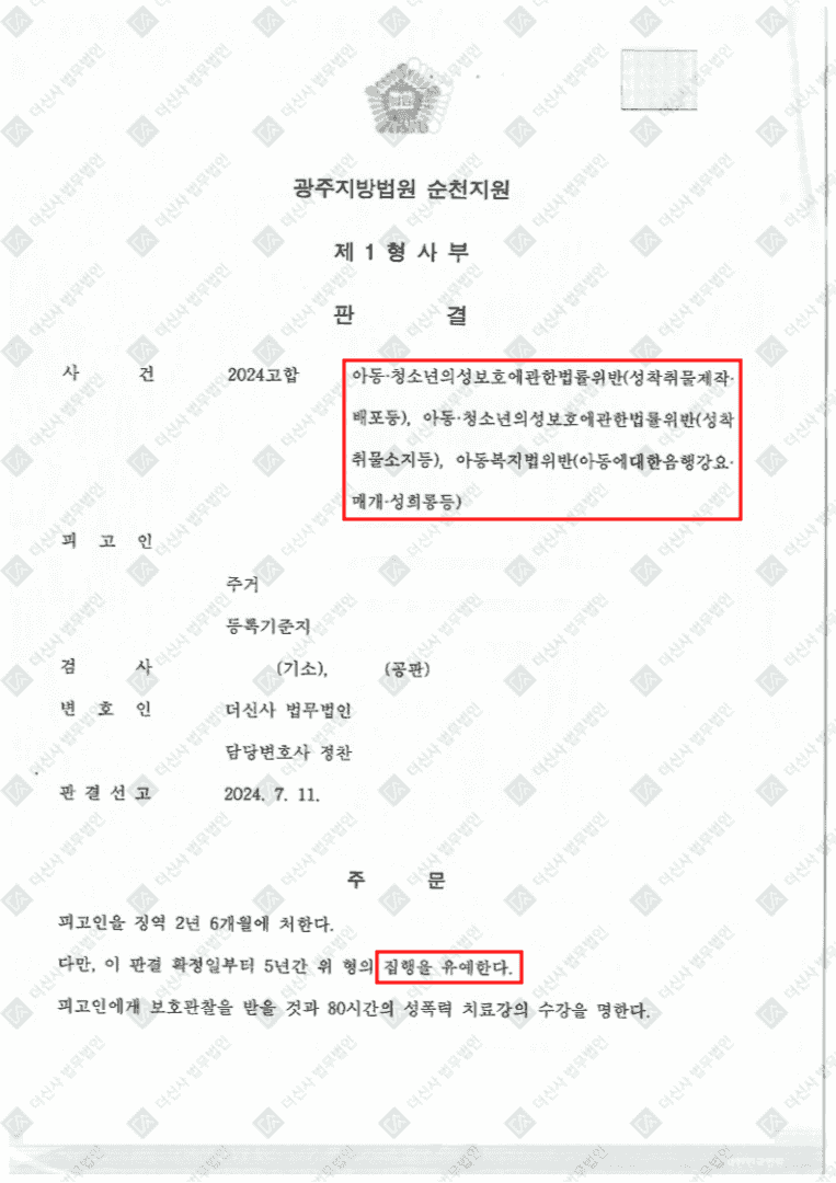 의뢰인이 받고 있는 혐의가 아청법위반, 아동복지법 위반에 피해자의 수도 상당하였기에 매우 어려운 상황이었습니다. 의뢰인은 자신이 저지를 행위에 대한 반성을 하고 있었지만, 실형의 가능성이 상당히 높은 상황이었기에 저희는 빠른 대응을 진행하였습니다. 피해자와의 합의를 진행하였고, 동시에 선처를 받을 수 있는 부분에 대한 검토 및 의견서 제출 등을 통해 처벌의 감경을 목표로 사건을 진행하였습니다. 결국 의뢰인은 사실상 실형에 가까운 상황에서 집행유예라는 매우 성공적인 결과를 받을 수 있었습니다.