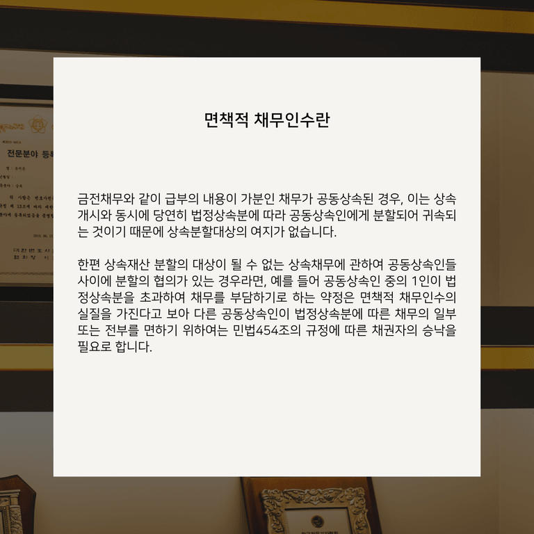 이는 곧 아무리 상속인 사이에 채무를 단독 승계하는 것으로 협의했다 하더라도 협의사항을 지킬 법적 의무는 없다고도 볼 수 있습니다.