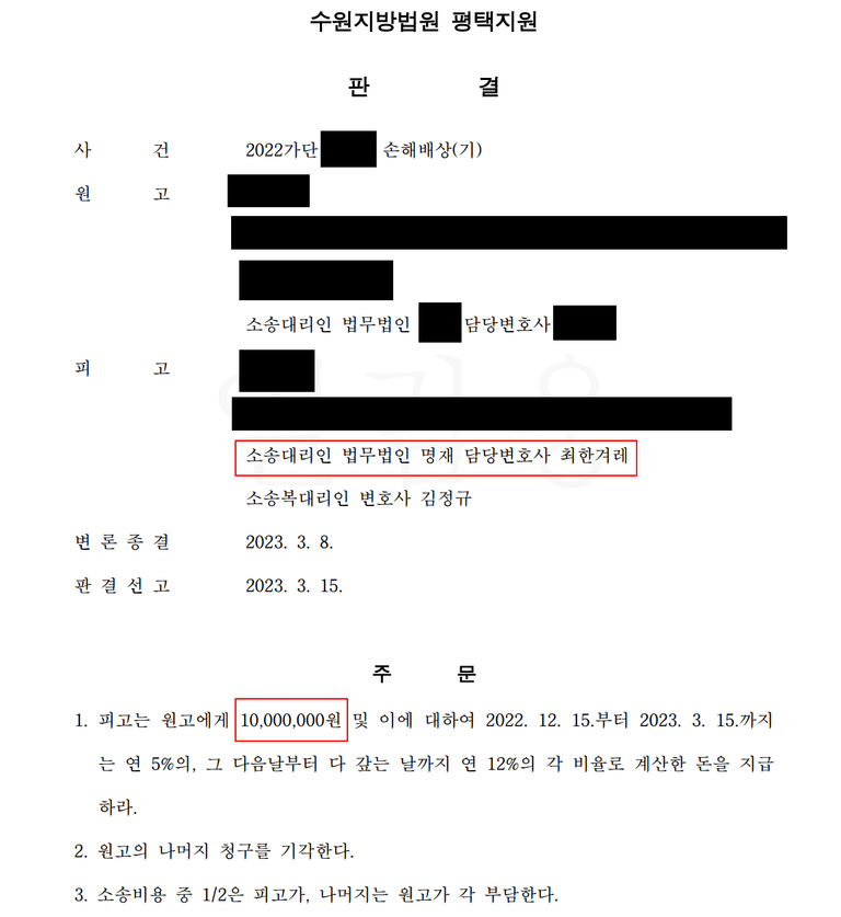부정행위가 인정되면서, 피고는 원고에게 위자료 1천만 원을 지급하라는 판결이 나옵니다.