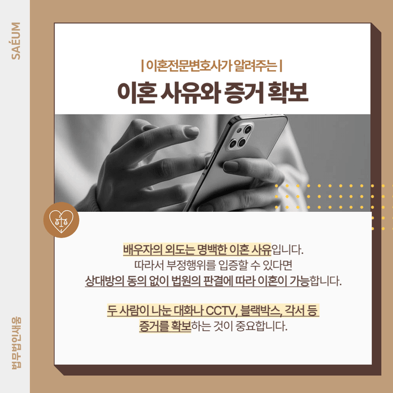 그렇기에 우선 증거부터 확보해야 하는데요. 두 사람이 나눈 메시지나 CCTV, 블랙박스 영상, 목격자의 증언이나 배우자나 상간자가 작성한 각서, 녹취 등 다양한 것들이 증거가 될 수 있습니다. 이런 증거를 확보한 후에 이혼사유를 밝히고 본격적인 대응에 나서보는 것이 좋습니다.