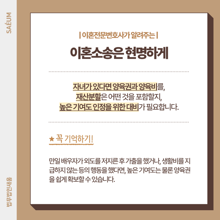 상간소송에서 중요한 것은 이혼사유와 위자료만이 아닙니다. 자녀가 있다면 누가 자녀를 키울 것이며 양육비는 얼마나 지급할 것인지, 재산분할은 어떤 것을 포함하여 기여도를 얼마로 설정할 것인지 등에 대해서도 대비해야 합니다. 전체적인 이혼의 조건에 대해 조율할 수 있어야 긍정적인 경과를 기대해 볼 수 있기에, 충분한 대비를 해야 합니다.