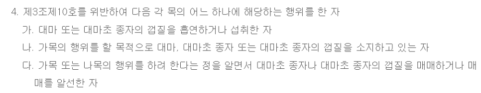 '마약류 관리에 관한 법률'은 대마를 흡연, 재배, 소지, 소유, 수수, 운반, 보관한 경우에는 5년 이하의 징역 또는 5,000만 원 이하의 벌금에, 대마를 제조, 매매하거나 매매를 알선한 경우에는 1년 이상의 징역에, 필로폰, 엑스터시, 케타민 등과 같은 마약류를 매매, 매매 알선, 수수, 소지, 소유, 사용, 관리, 조제, 투약, 제공한 경우에는 10년 이하의 징역 또는 1억 원 이하의 벌금에 처하도록 규정하고 있습니다.