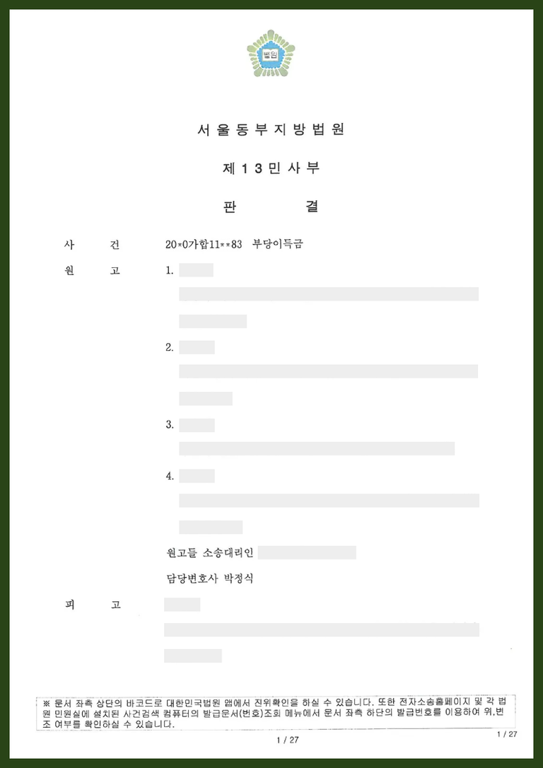 이에 원고들은 피고가 수령한 임대보증금 증액분과 피상속인의 계좌에서 인출하여 사용한 금액, 피상속인 사망 이후 피고가 임차인들로부터 받는 임대료 등에 대하여 부당이득금반환청구를 한 사건입니다.
