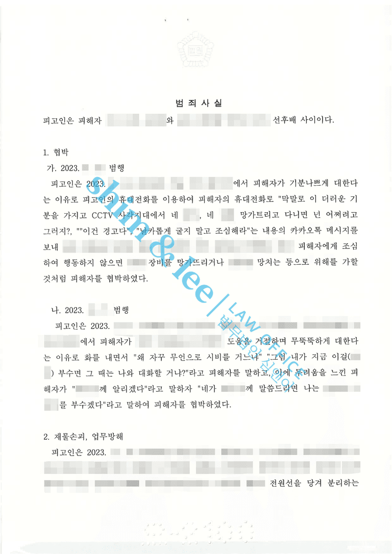 - 마침내 가해자는 의뢰인을 협박하고 의뢰인의 재물을 손괴하여 업무방해까지 저지른 혐의가 모두 인정되어 벌금 500만 원의 구약식 처분을 받았습니다.