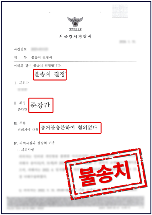 사건을 담당한 서울강서경찰서는 이와 같은 변호인의 주장이 타당함을 인정해주며 의뢰인에게 무혐의 결정을 내려주었습니다.
