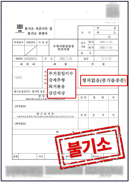 그러나 얼마 지나지 않아서 다른 이유로 두 사람은 이별하게 되었고 이후 사건 당일을 구체적으로 명시하며 의뢰인을 신고하였습니다. 의뢰인이 받고 있던 혐의는 무려 주거침입미수, 강제추행, 퇴거불응, 강간치상 4가지였으며 모두 형량이 무거운 죄목이었는데요.