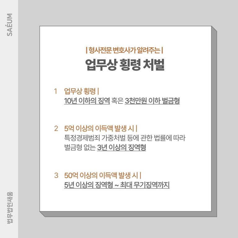 업무상횡령은 중대한 경제범죄 중의 하나이며, 종종 수십억 원에 이르는 대규모 범죄를 저지르는 경우가 있습니다. 만일 5억 이상의 이득액이 발생한 중대한 범죄일 경우 특정경제범죄 가중처벌 등에 관한 법률에 따라 3년 이상의 징역형에 처하며, 50억 이상이면 5년 이상 혹은 무기징역형까지 선고가 될 수 있어 주의가 필요합니다.