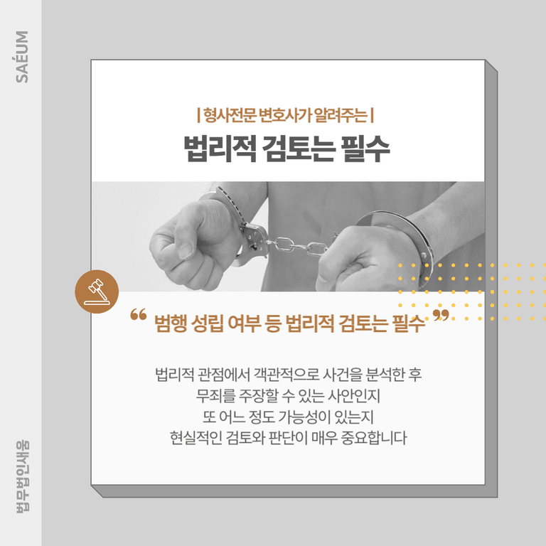 다소 억울한 부분이 있더라도 혐의를 부인하기 어려운 상황이 있을 수 있습니다. 이런 상황에서 섣불리 무죄를 주장하는 경우 오히려 상황이 불리하게 진행되어서 무거운 처벌로 이어질 수 있습니다. 따라서 법리적인 관점에서 객관적으로 사건을 분석한 후에 무죄를 주장할 수 있는 사안인지, 어느 정도의 가능성이 있는지를 현실적으로 파악해 봐야 합니다.