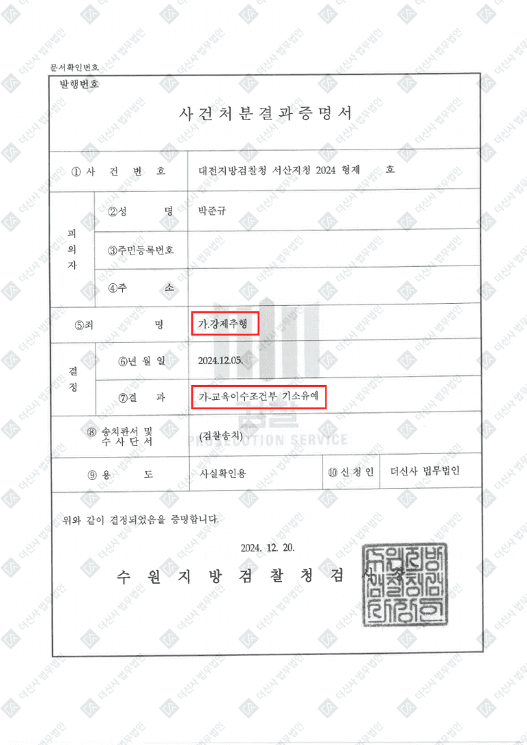 의뢰인이 더신사 법무법인을 방문했을 때, 이미 경찰 조사가 임박한 상황이었습니다. 상담을 통해 사건의 전반적인 내용을 분석한 결과, 범행 사실을 부인하기 어려운 부분이 확인되었습니다. 이에 성범죄 사건에 대한 풍부한 경험을 바탕으로 변호인이 직접 조사에 동행하며, 의뢰인이 불리한 진술을 하지 않도록 사전에 충분한 준비를 진행하였습니다. 조사 전 의뢰인과 함께 시뮬레이션을 통해 예상 질문에 대비하고, 부족한 부분을 보완하며 진술을 철저히 점검하였습니다. 또한 의뢰인의 불안감을 줄이고 사건에 집중할 수 있도록 심리적 지원도 병행하였습니다. 이러한 체계적인 조력의 결과, 의뢰인은 원하던 대로 기소유예 처분을 받을 수 있었습니다.