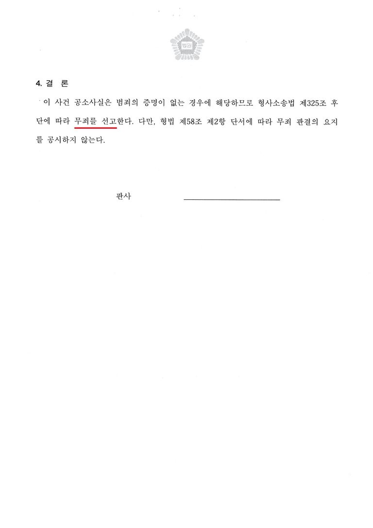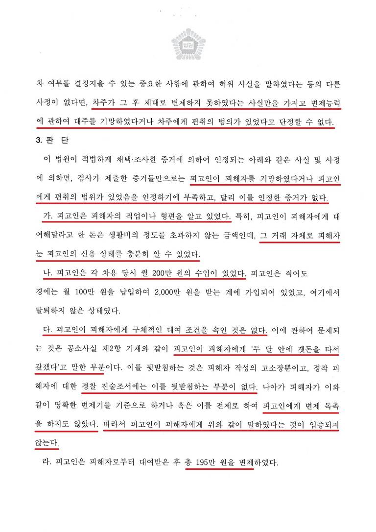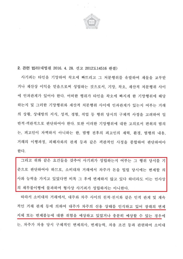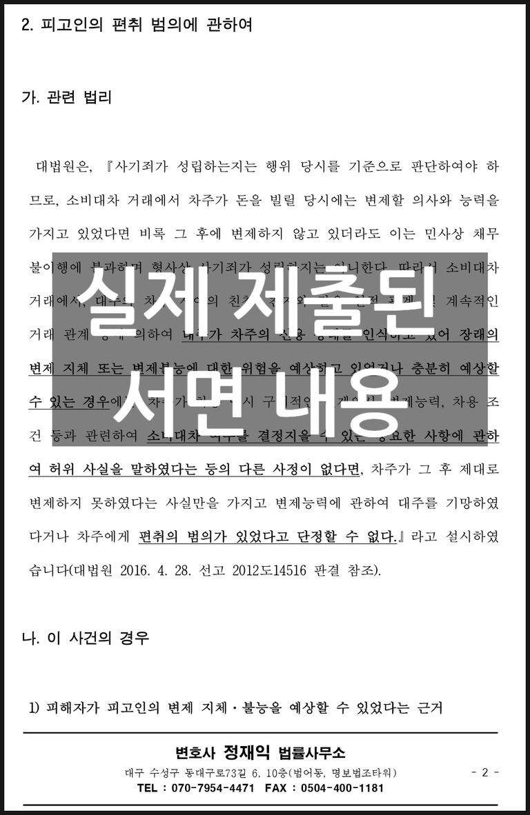 재판부는 제가 근거로 삼았던 대법원 판례를 그대로 관련 법리로 채택했을 뿐 아니라, 제가 강조했던 변제 의사와 능력이 있었음을 인정했고, 또한 B씨가 A씨의 변제 지체 및 불능을 예상할 수 있었다는 주장 역시 인정하였습니다. 그 결과 재판부는 사기죄에 대하여 무죄를 선고하였습니다.