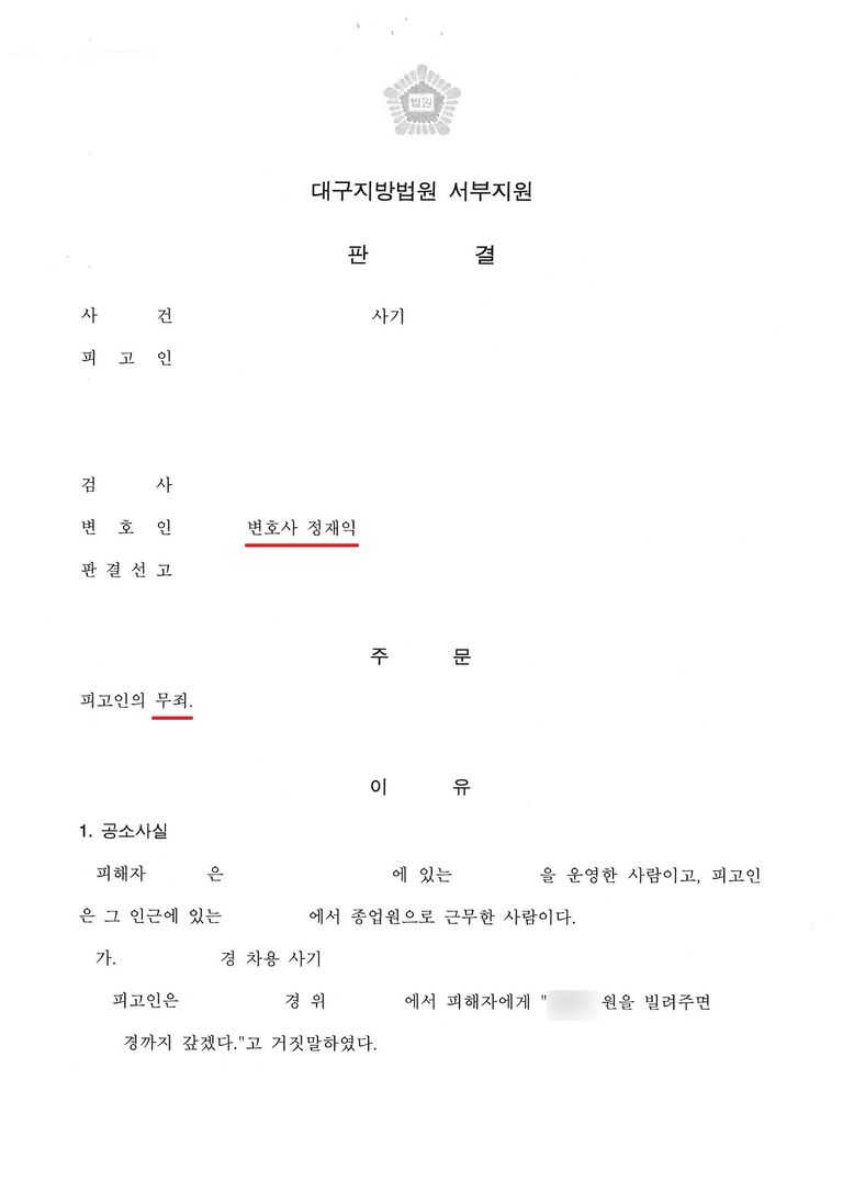![[대구사기변호사] 억울한 사기죄 기소, 무죄 선고 받아냈습니다.](/_next/image?url=https%3A%2F%2Fd2ai3ajp99ywjy.cloudfront.net%2Fuploads%2Ftitleimage%2Foriginal%2F5c2333e6227b15a91df80b60-original.jpg&w=3840&q=75)