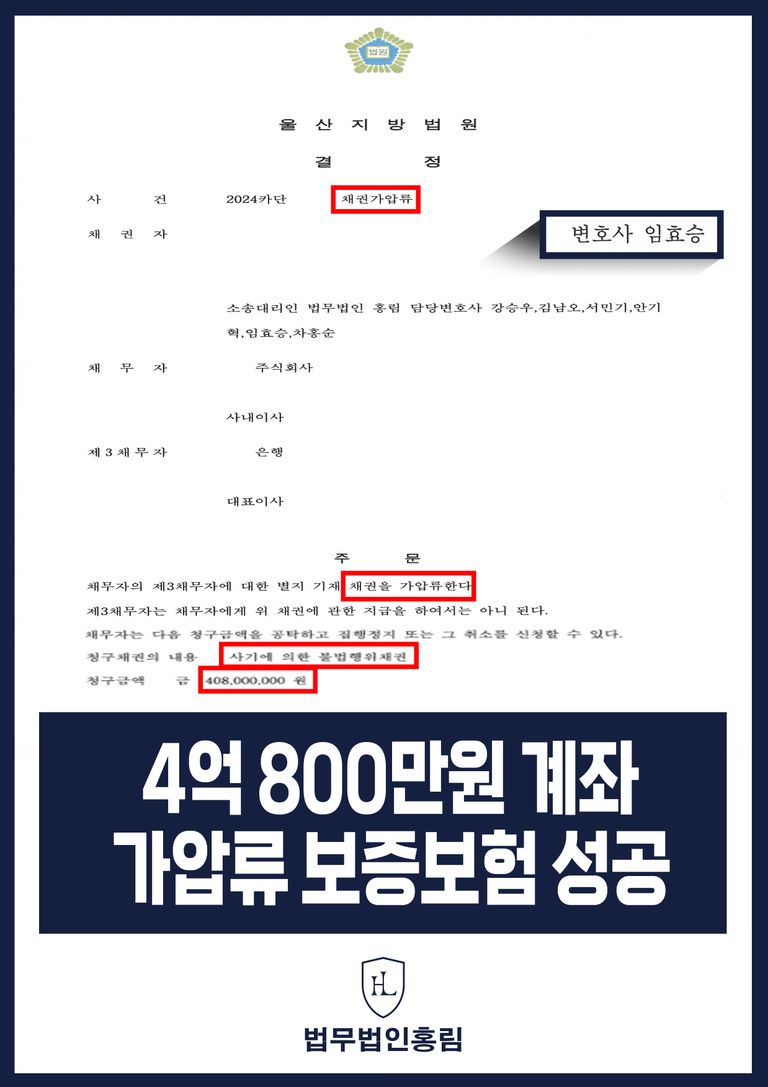 그 결과 법원에서는 본 변호인의 주장을 받아들여 통장 가압류(전액 보증보험)하였습니다.