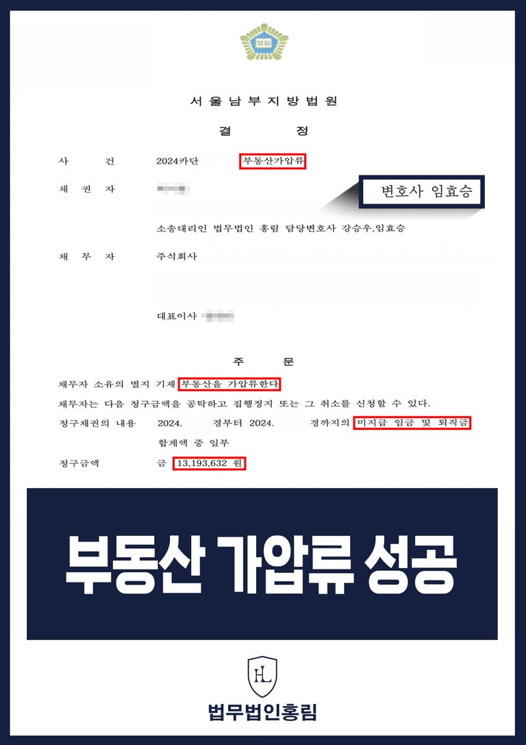 본 법무법인은 의뢰인 A씨와 사건을 같이 살폈습니다. 근로계약서, 근로확인서, 사직서 및 B 사업주간 대화 내역을 토대로 A씨가 B 사업주 아래에서 오랜 기간 근무한 사실을 증거자료로 모았습니다. 그리고 사건을 살핀 바 B씨가 대금을 모두 납부할 능력을 상실할 위기에 놓였기에 채무자의 부동산을 우선적으로 가압류 하기로 결정하였는데요. 따라서 본 변호인은 부동산가압류신청서를 통해 관련 증거자료를 정리하고 해당 소송의 목적을 분명히 하여, 가압류가 실행되지 않을 경우 추후 앞선 채무를 변제 받기 힘들 것을 강력히 주장하였습니다.