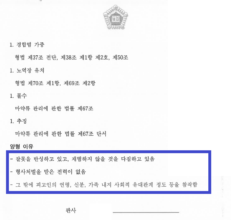 이후 저는 반성문, 탄원서, 정신과 진료내역서, 마약퇴치운동본부 프로그램 참여 내역서, 단약서약서, 단약일기 등 여러 양형자료를 바탕으로, A씨는 B양의 계속된 요구에 필로폰을 투약하게 되었다는 점, A씨는 재범을 저지르지 않기 위해서 주기적으로 정신과 진료를 받고 있을 뿐만 아니라 지속적으로 마약퇴치운동본부 프로그램에 참여하고 있다는 점, A씨는 단약서약서를 작성하였을 뿐만 아니라 매일 단약일기도 작성하는 등 필로폰을 끊기 위한 의지가 강하다는 점, A씨는 수사에 적극적으로 임하였다는 점 등을 적극적으로 어필하며 '이번에 한하여 마지막으로 가벼운 벌금형을 선고해 달라'는 내용의 변호인의견서를 법원에 제출하였습니다. 또한 A씨에 대한 피고인신문을 통해 위 내용을 재판부에 적극적으로 주장하였습니다.