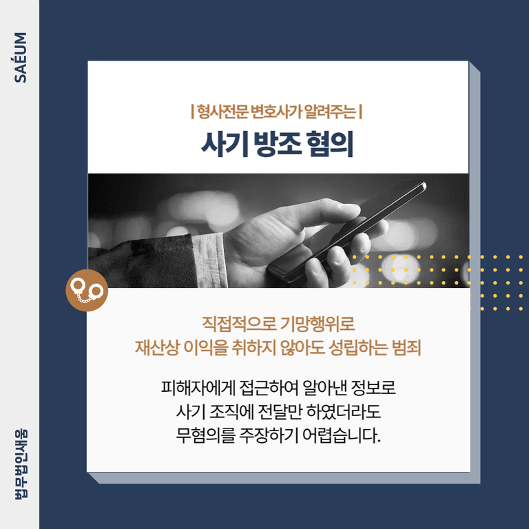 사기 방조 혐의는 직접적으로 기망행위를 통해 재산상의 이익을 취하지 않았더라도 성립하는 범죄입니다. 피해자에게 접근하여 알아낸 정보를 가지고 대포통장으로 사용하였는데 이러한 사실을 전혀 모른 채 출금해서 조직에 전달만 하였더라도, 혐의를 부인하기가 어렵습니다. 결과적으로 조력을 제공하여 제3자로 하여금 이익을 얻도록 하였기 때문입니다.