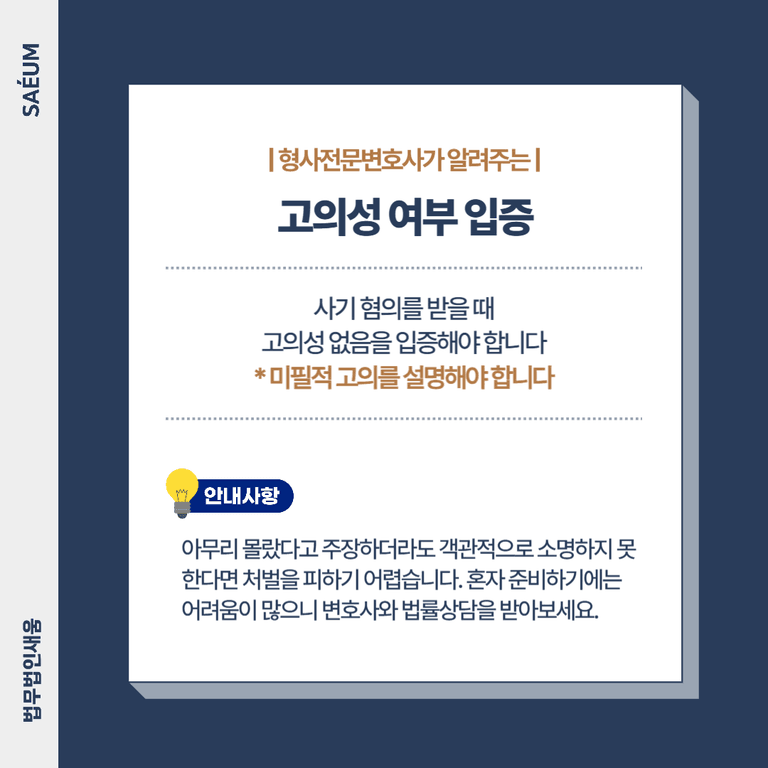 특히 요즘에는 보이스피싱으로 인한 피해가 증가하면서, 미필적 고의를 인정하는 사례들이 더욱 많습니다. 아무리 몰랐다고 주장하더라도 객관적으로 소명하지 못한다면 처벌을 피할 수 없으므로, 사기전문 형사전문변호사의 도움을 받으시기를 바랍니다.