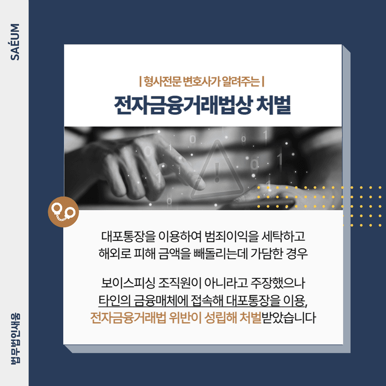 만일 자신이 이러한 행위에 가담한 사실이 밝혀진다면, 직접적으로 사기를 계획하지 않았다 해도 형사 처벌을 피할 수 없습니다. 일련의 과정에 타인의 금융정보를 제공하거나, 접근 매체를 이용한 사실이 드러나면 마찬가지로 책임을 묻기 때문에 주의해야 합니다.