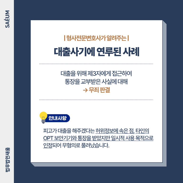 하지만 반대로 또 다른 대출사기 관련 판례에서는 피고가 대출을 위해 제3자에게 접근하여 통장을 교부받은 사실에 대해 무죄를 선고하였는데요. 이 경우 피고가 대출을 해 주겠다는 허위 정보로 인해 속은 점, 타인의 OTP 보안기기와 통장을 받았지만, 일시적인 사용의 목적임이 맞다고 보고 무혐의로 풀려났습니다.