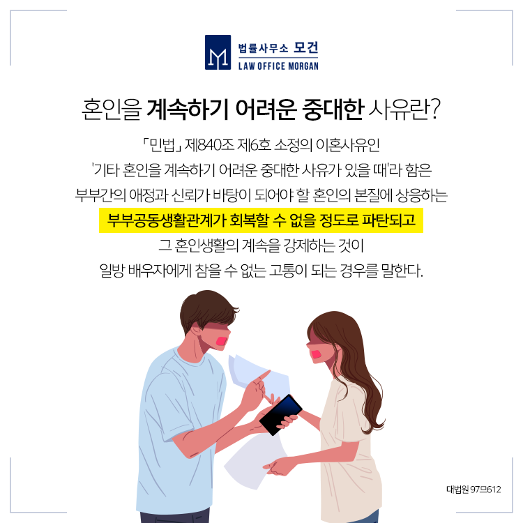 비록 직접적인 외도이혼이 아니더라도, 이미 부부간의 신뢰관계가 회복되지 않고 오히려 혼인관계를 계속하는 것이 고통스러우신 분들이라면 종로이혼전문변호사의 도움을 받아 이혼절차를 논의해보시기 바랍니다.