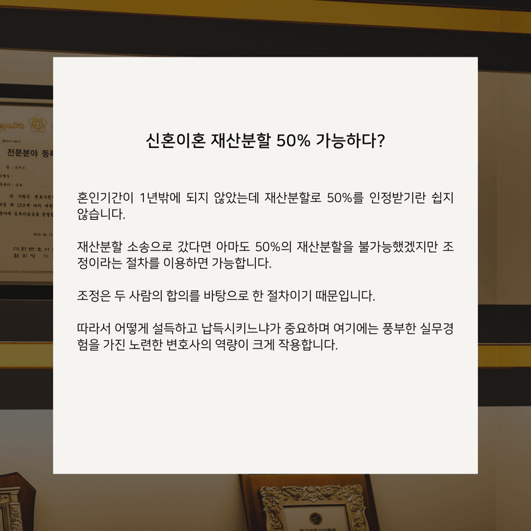 하지만 저희 법률사무소 카라 승소사례 중에는 혼인기간이 1년밖에 되지 않았음에도 의뢰인이 50%의 재산분할을 가져온 사례가 있는데요,