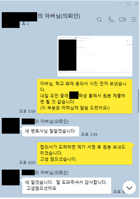 그 후 수회에 걸쳐 합의 조항을 수정하였고, 학교에서 심의회로 넘어가기 직전 간신히 합의를 하게 되었습니다. 학폭 담당 선생님께 몇 번이나 연락 드렸는지 모르겠습니다..^^