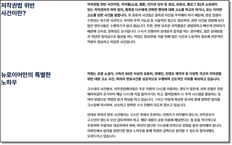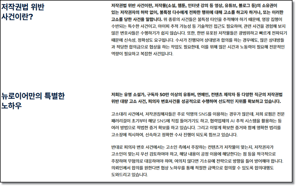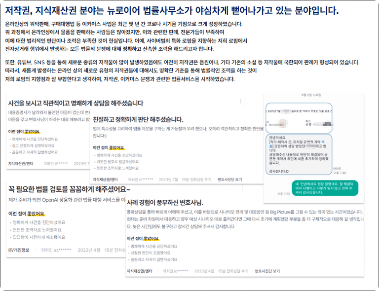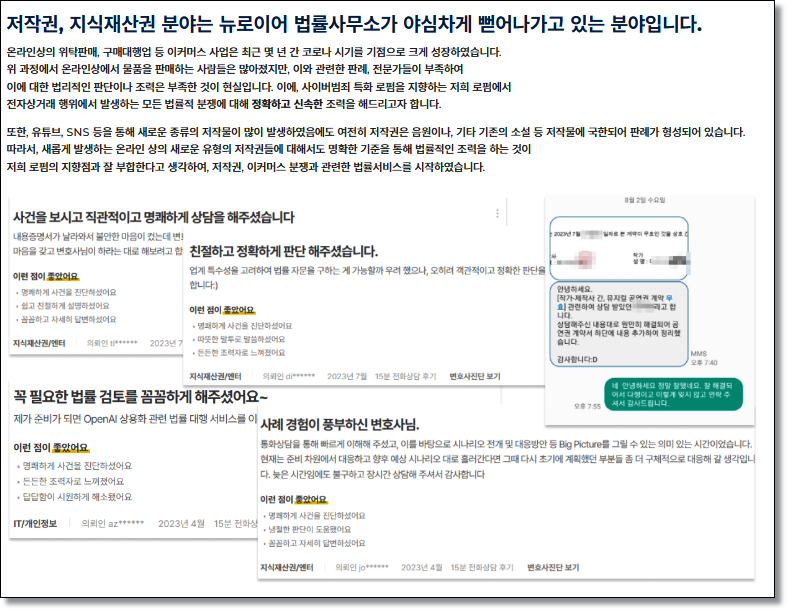뉴로이어 법률사무소는 스마트스토어 상세페이지 저작권위반 사건에 대한 뛰어난 대응력을 자랑합니다. 저희는 저작권 관련 법률에 대한 깊은 이해와 풍부한 경험을 바탕으로, 최신 트렌드 및 판례를 반영하여 전략적으로 대응하는 맞춤형 법률 서비스를 제공합니다. 특히, 저작권 침해로 인한 법적 분쟁의 경우, 신속하고 효과적인 대응이 중요한데요 뉴로이어는 고객의 입장을 최대한 반영하여, 저작권자와의 합의 과정에서 유리한 조건을 이끌어낼 수 있도록 지원합니다.