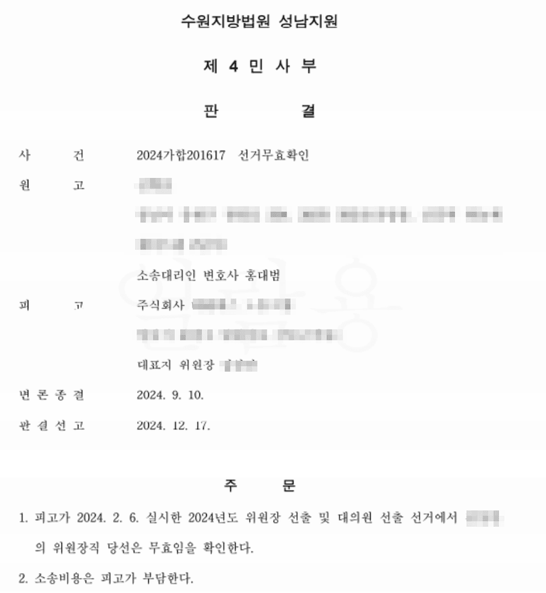 저는 위 노동조합의 경우 지금까지 한번도 복수 후보가 출마하여 선거를 치른 사실이 없다는 것 자체가 선거규정의 하자를 나타내는 것이라 주장하였고, 결국 재판부에서 위 주장을 받아들여 선거무효 판결을 해주셨습니다. 이에 따라 위 노동조합은 지적된 선거규정을 수정하고 다시 위원장 선거를 치르기로 하였습니다.
