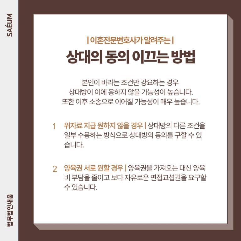 예를 들어서 상대방에게 위자료 지급을 원하지 않으면 지급하지 않는 대신 상대방이 다른 조건을 일부 수용하는 방식으로 동의를 끌어내 볼 수 있습니다. 또한 양육권을 서로 원할 때도 양육권을 가져오는 대신 양육비 부담을 줄여주고 보다 자유롭게 면접 교섭을 할 수 있다는 등의 제안을 통해 조건을 성립할 수 있도록 유도할 수 있습니다.