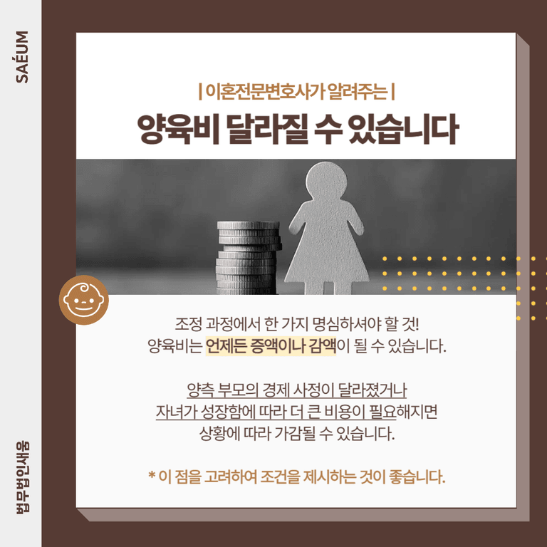 조정 과정에서 한 가지 명심하셔야 하는 것은 양육비는 언제든 증액이나 감액이 될 수 있다는 것입니다. 조서에 명시를 했을지라도 양측 부모의 경제적인 사정이 달라졌거나 혹은 자녀가 성장함에 따라 더 큰 비용이 필요해지면 상황에 따라 가감이 될 수 있습니다.