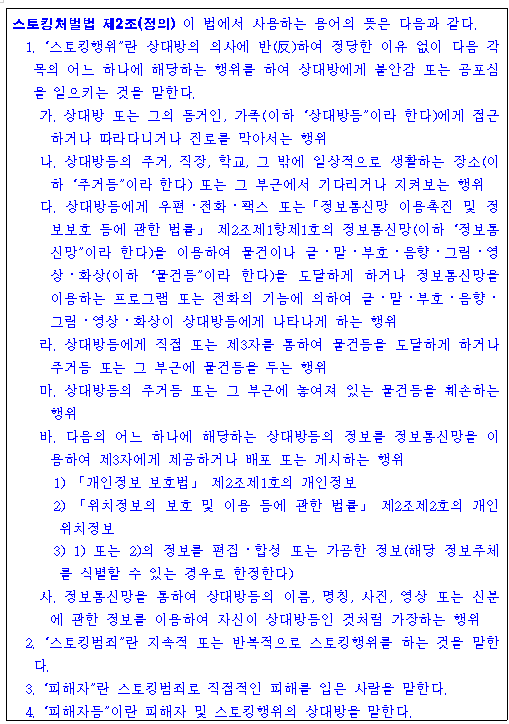 해당법에 따르면 지속적이거나 반복적으로 상대방의 의사에 반하여 정당한 이유없이 연락 등을 함으로써 상대방에게 불안감이나 공포심을 일으키는 경우 스토킹범죄로 봅니다.