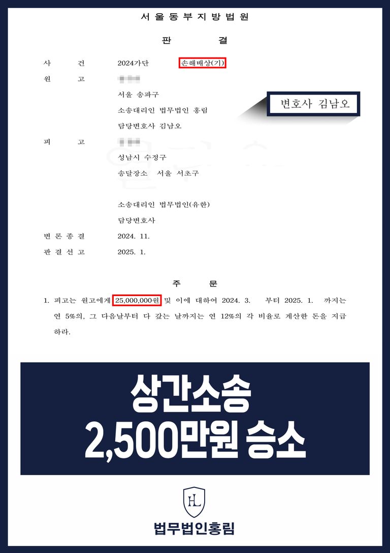 그 결과 재판부에서는 변호인의 의견을 받아들여 변호인의 주장이 타당하기에 피고는 원고에게 2,500만원 지급하라고 판시하였습니다.