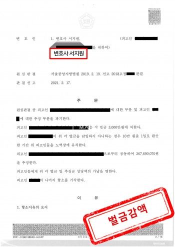 결국 재판부는 의뢰인의 범행이 '미필적 고의'에 의한 것이라고 인정하고, 벌금을 3,000만 원으로 감액해주었습니다. 또한 원심에서는 추징금이 의뢰인과 A에게 각각 2억 6,000만 원이 부과되었으나, 항소심에서는 공동 범행의 특성을 고려하여 추징금을 '각'이 아닌 '공동하여' 부과하도록 판결을 이끌어냈습니다.