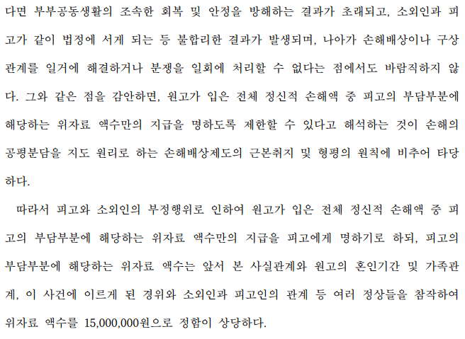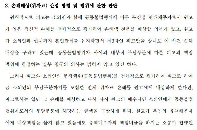 1편에서 말씀드린 것처럼 남편과 상간녀 사이에는 책임의 정도가 다르기 대문에 부담해야 되는 위자료도 다른데요.