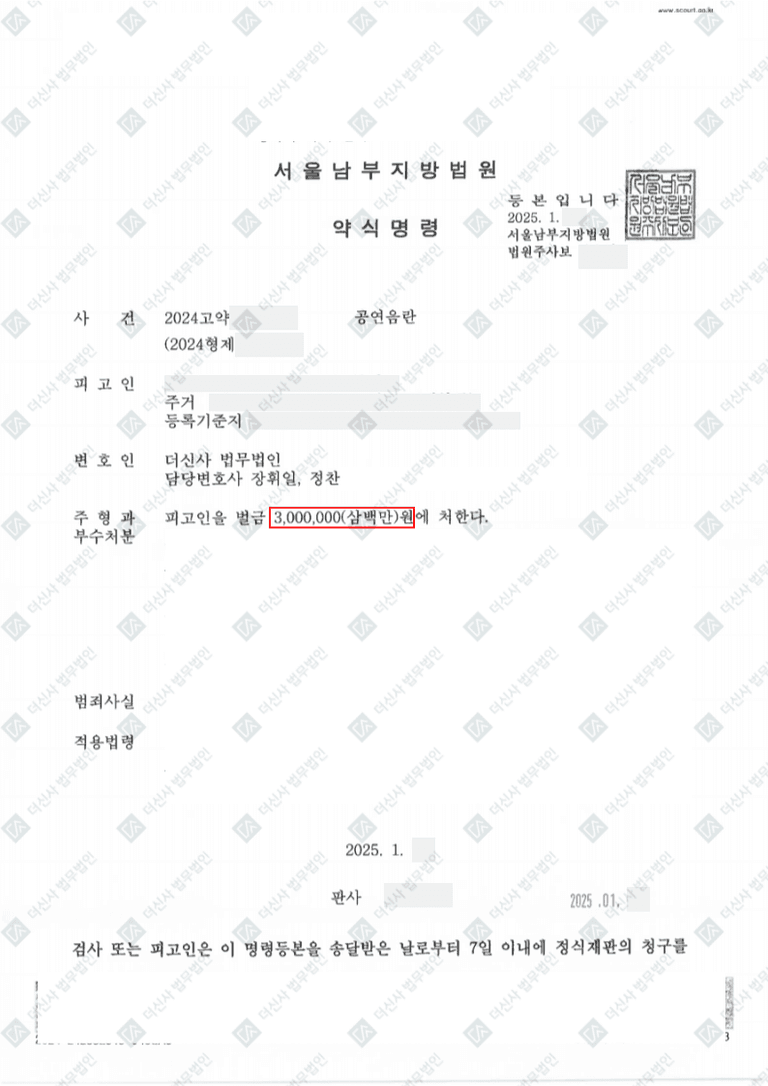결과 | 약식처분 (벌금 300만 원) / 서울남부지방법원