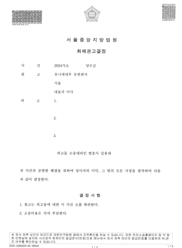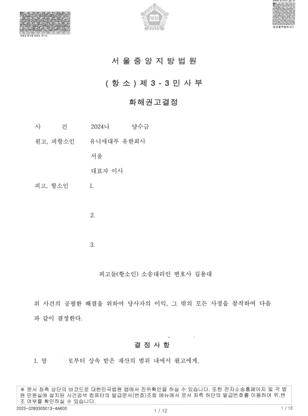 이에 A, B, C는 본 법률사무소에 위 사건 일체에 대한 법적 대응을 위임하였고, 이에 본 법률사무소는 A, B, C를 대리하여 특별한정승인을 신청하면서, 2014년경 확정된 판결에 대하여는 추완항소장을 그리고 소멸시효 연장을 위한 2024년 양수금 청구소송에는 답변서를 제출하였고, 추후 A, B, C에 대한 특별한정승인 수리결정이 이루어짐에 따라 2014년 추완항소 사건에서는 A, B, C가 상속받은 재산의 범위 내에서만 채무를 갚는 것으로, 그리고 2024년 양수금 청구소송은 중복소송으로서 원고가 소송을 취하하는 것으로 화해권고결정을 받게 되었습니다.