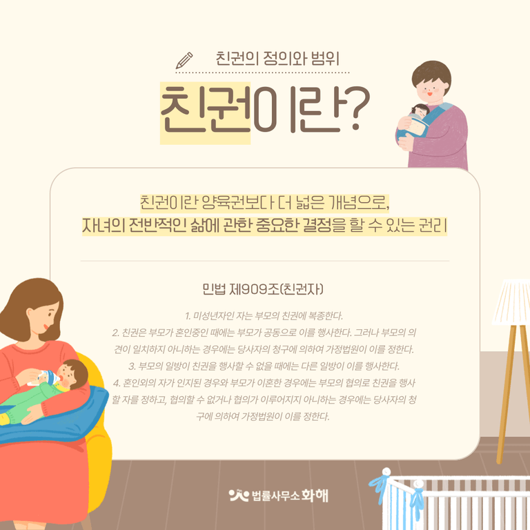 먼저 친권이란 양육권보다 더 넓은 개념으로, 자녀의 전반적인 삶에 관한 중요한 결정을 할 수 있는 권리를 뜻합니다. 민법 제909조에 근거한 친권은 자녀의 보호와 교양에 관한 권리와 의무, 거소지정권, 재산관리권 등을 포함하는데요.