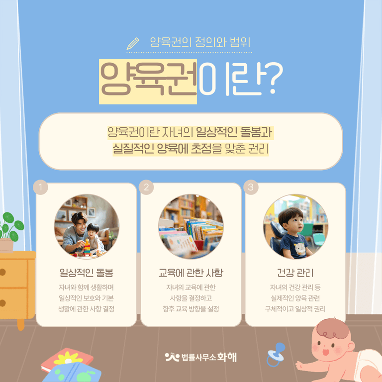 양육권자는 자녀의 기본적인 생활에 관한 사항을 결정하고, 교육 방향을 설정하며, 건강 관리를 담당합니다. 쉽게 말해, 양육권은 자녀의 실제적인 양육과 관련된 더 구체적이고 일상적인 권리라고 할 수 있습니다.