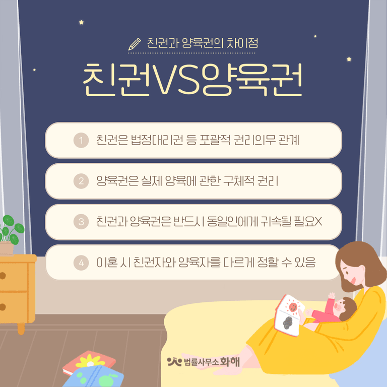 이렇듯 친권과 양육권은 그 성격이 조금씩 다릅니다. 정리하자면 친권이 더 넓은 개념이고 양육권은 일상적인 돌봄과 양육에 초점이 맞춰져 있죠. 그래서 친권자는 자녀를 대신해 법적 문서에 서명하거나 중요한 결정을 할 수 있지만 양육권자는 반드시 이런 권한을 갖지는 않습니다.