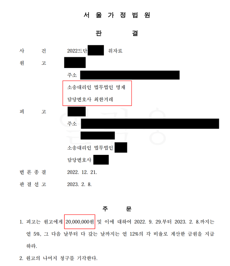 피고는 원고에게 위자료 2천만 원을 지급하라는 판결이 나옵니다.