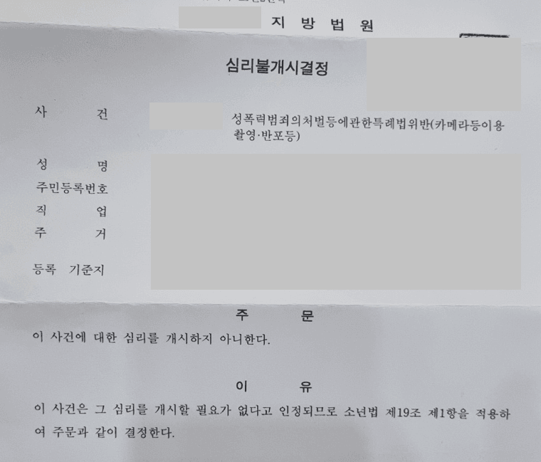 5. A씨는 아동청소년성착취물제작등 사건에서 저희의 조력을 받음으로써 소년보호 사건에서 심리불개시 결정을 받고 일상으로 돌아갈 수 있었습니다.
