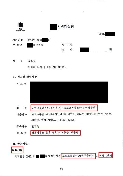 위 공소장 공소사실에도, 범죄전력으로 의뢰인의 음주운전 집해유예 전과가 기재되어 있습니다.