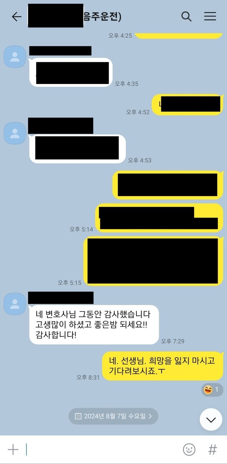 첫 재판을 마친 날 의뢰인께서는 무언가 체념한 듯 제게 그동안 감사했다는 카카오톡 메시지를 보내주셨습니다.
