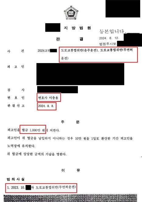 이번 사건은 음주운전집행유예 기간 중의 음주운전 및 무면허운전이였고, 집행유예기간이 도과되지 않았기에 실형 가능성이 매우 높았던 상황이였는데, 그걸 뒤집고 벌금 1,000만 원 선고를 받았습니다.