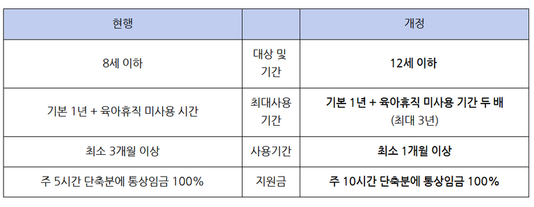이러한 근로시간 단축 제도도 확대됩니다. 원래는 8세 이하 자녀까지 가능했다면, 이제는 12세 이하 자녀까지 확대되었습니다.