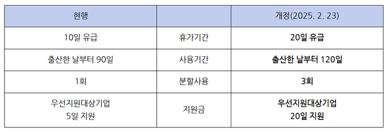 2025년 2월 23일부터 배우자가 사용할 수 있는 출산휴가가 10일 유급에서 20일 유급으로 확대되었습니다. 그리고 고용보험을 통해 지원받을 수 있는 금액도 기존 5일에서 20일 전체로 늘어났습니다. 지원금의 경우, 우선지원대상기업에만 적용되는 사항이라는 점 유의하시기 바랍니다.