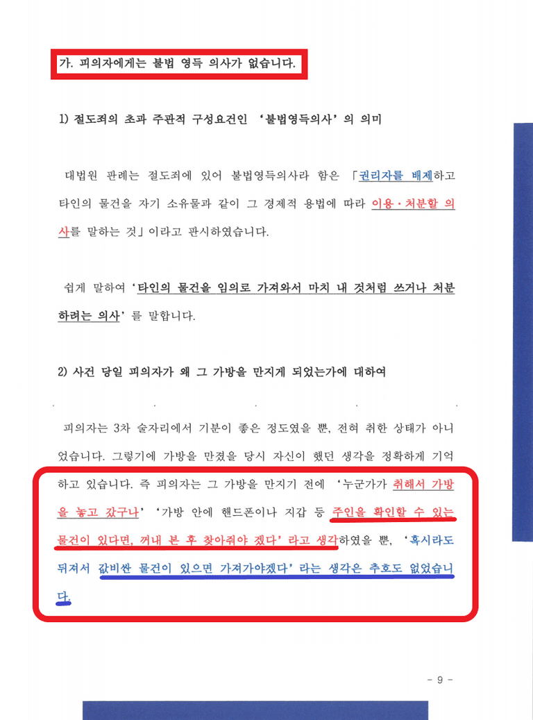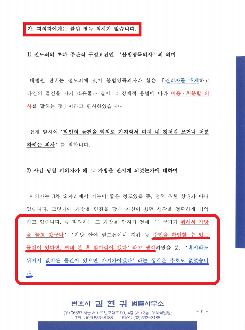 그런데 심각한 문제는, 수사를 진행하는 경찰들의 태도입니다. CCTV 속 A의 행동만 보고 "술집 주인이 할 일이지? 왜 당신이 가방을 뒤지느냐?" "안에 현금이나 귀금속을 찾으려고 한 것 아니냐" 라고 추궁하는 경우가 상당히 많습니다. 따라서 절도의 고의를 부인하는 과정을 적극 진행해야 합니다.