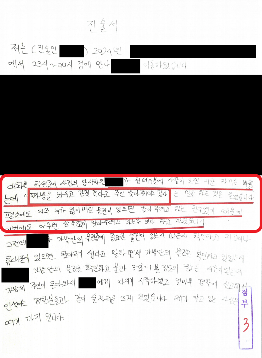 그래서 옆 테이블로 이동하여 가방을 뒤지고 있던 찰나 가방 주인 B가 나타나 "지금 뭐하는 거냐? 왜 남의 가방을 뒤지는 거냐?"라고 소리쳤습니다. A는 주인찾아주려고 했다고 말하였으나, B는 그 말을 믿지 않았고 바로 경찰에 신고하여 입건되었스니다. A는 너무 억울한 마음에 경찰 조사 전 저를 선임하였습니다.