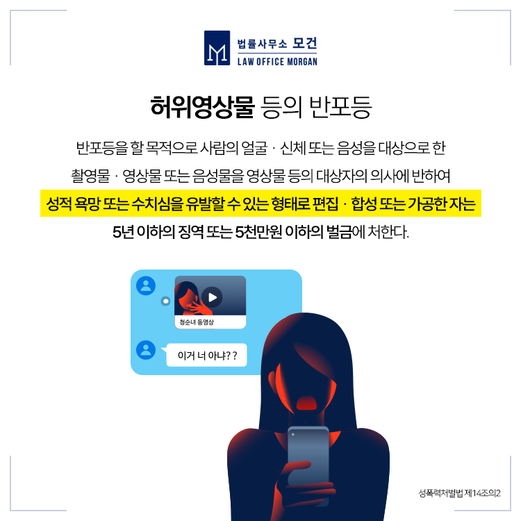딥페이크 사진이나 영상의 대상이 아동·청소년이라면 청소년성보호법(아청법)에서 규정하는 아동·청소년 성착취물에 해당하므로, 아청법 적용으로 더욱 엄중한 처벌을 받게 됩니다.