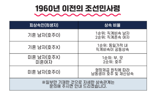 그러나 호주가 아닌 기혼인 남자가 사망한 경우에는 아들과 미혼인 딸이 동일한 비율로 상속받았는데요. 다만 기혼인 딸은 출가외인이라 하여 상속받을 수 없었습니다.